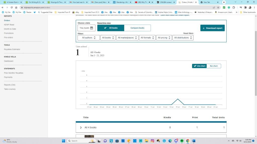 So, okay. I am disappointed that sales of Reunion have not even reached the “100 Copies Sold!” mark. But, hey…someone bought a copy sometime last week, and my royalties of $3.21 will be processed and deposited in my bank account by the 29th.