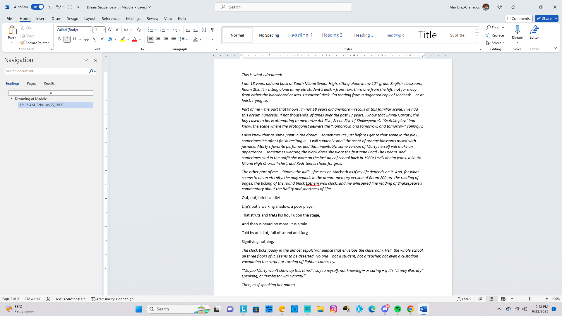 Nevertheless, I managed to get some work done on Scene Three, Chapter Eight (aka The Dream). I fixed a few grammatical errors I missed yesterday, then went ahead and replaced the existing version of the scene with the revised one on both the “official” Alpha file on Word and the WriteItNow save file. The Word .docx file will be the source for the Kindle Create upload when it’s time to self-publish Reunion: Coda, while the WriteItNow version will be a backup version, as well as the one where I can track the progress of the novel on the program’s “Story Board” function.