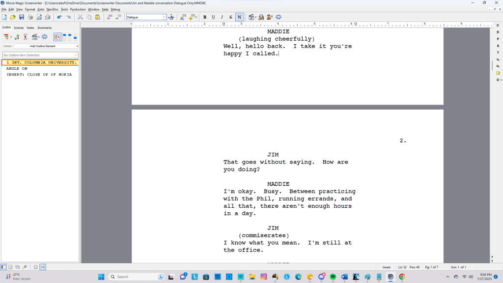 Apparently, writing part of the scene in Movie Magic Screenwriter 6.0 in screenplay format turned out to be an inspired choice. Not only did approaching a scene with a lot of “spoken lines” as if it were for a film rather than a novel help break a mental block, but adapting the script to the novel format was fun, not terribly hard to do, and effective.