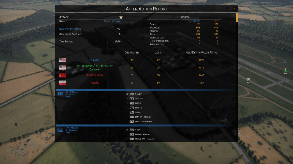 The result of yesterday’s Skirmish in Regiments. I am the Blue player; the AI-controlled 4th Brigade of the 4th Infantry Division is the Green (allied) player, and Soviet and Polish opponents (both Warsaw Pact “allies”) are the Red force. Note that Regiments combines NATO and Warsaw Pact casualties in the after-action report, but breaks the actual figures down by faction in the Players list, My deadliest unit, apparently, was a two-helicopter section of AH-1F Cobra gunships (callsign: Voodoo).