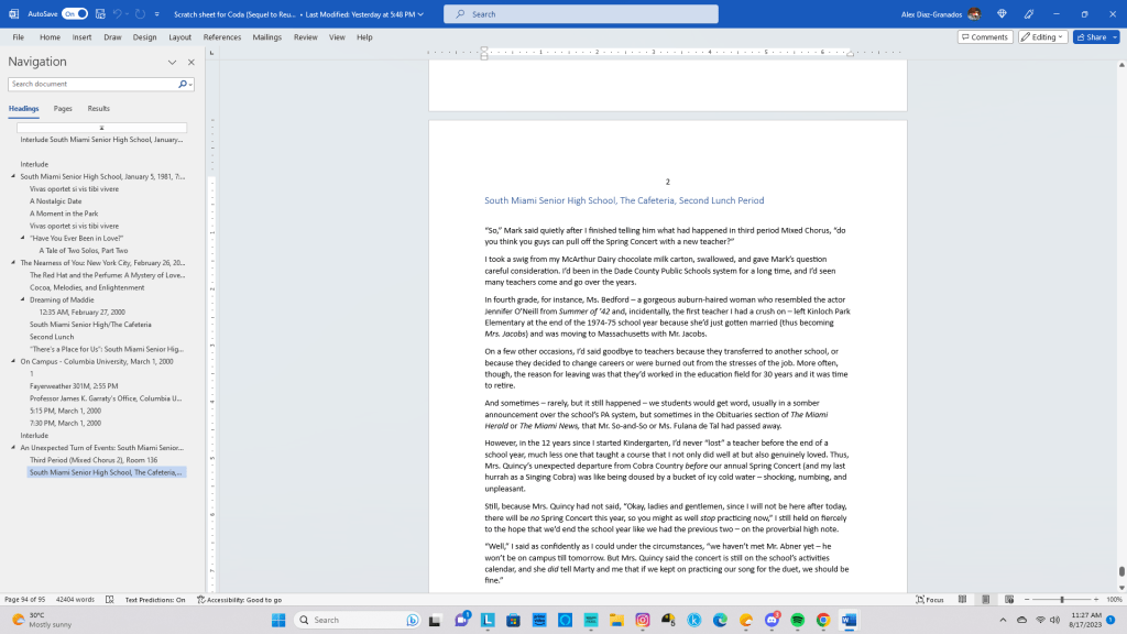 Because I got started โ€“ admittedly โ€“ at an extremely late hour (between 3:30 and 4 PM), I did not write a hell of a lot in the โ€œscratch sheetโ€ file that I use to jot down rough first draft ideas on Word. Per the word count function on that app, I managed to coax a grand total of 585 words (11 paragraphs, 38 lines, including the temporary scene title) out of my weary little gray cells.