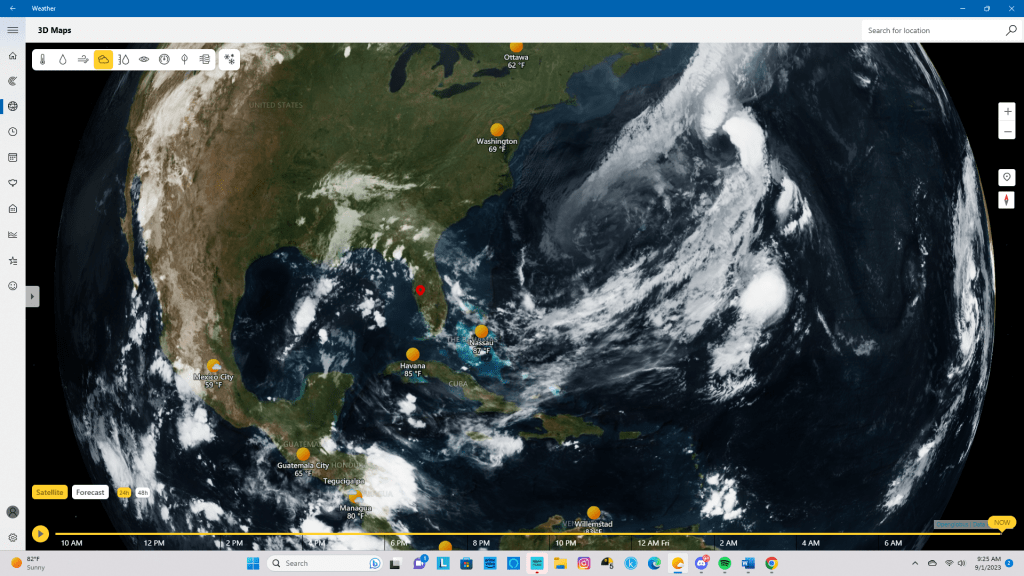 Hi, everyone. Well, here we are on the first Friday of meteorological fall. Here in Florida, of course, we feel the seasons of the year differently from other regions of the U.S. that are not in the subtropical zone. Here, as we bid farewell to meteorological summer – traditional, or astronomical summer doesn’t end till Saturday, September 23 – it is still hot and muggy. Outside, the temperature is 83°F/28°C under sunny conditions. With humidity at a sticky 88% and a becalmed northeasterly breeze of 1 MPH/2 KMH, the heat index is 96°F/35°C. Today’s forecast calls for partly sunny skies and a high of 91°F/33°C.