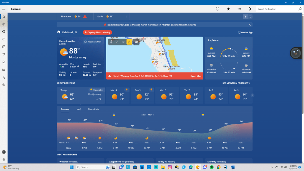 Currently, the temperature outside is 87°F/31°C under mostly sunny conditions. With the wind blowing from the northeast at 8 MPH/14 KMH and humidity at just 46%, the feels-like temperature is 89°F/32°C. Today’s forecast for the Tampa Bay area – which includes Lithia – calls for mostly sunny skies and a high of 88°F/31°C.