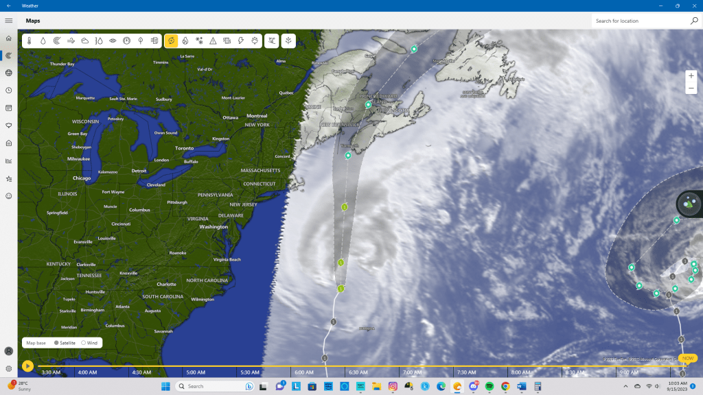 Hurricane Lee’s position at press time (shortly after 10 AM on September 15, 2023) and its projected track.