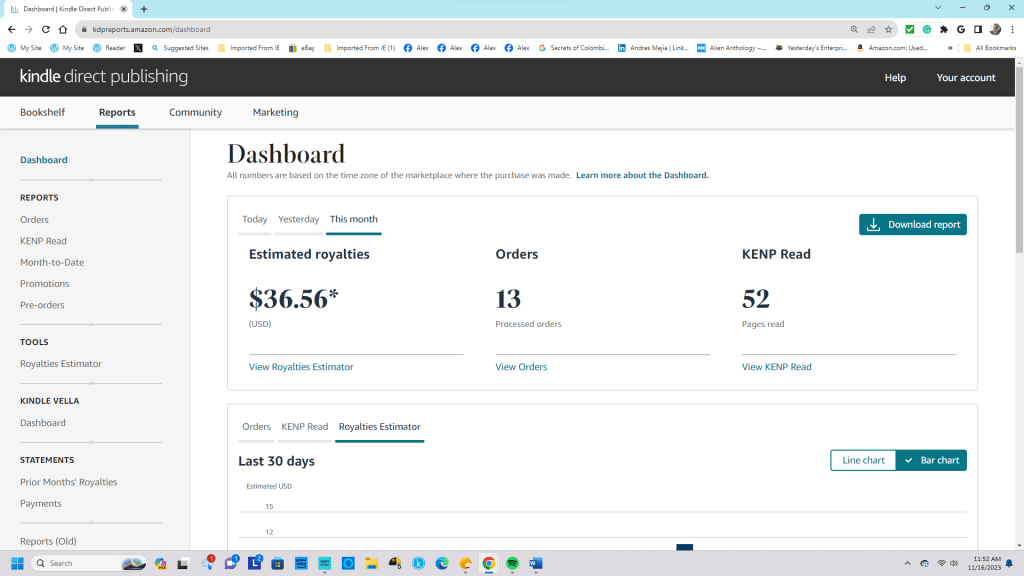Oh, and about Reunion: A Story. I’ve seen a modest increase in sales this month – 13 orders (1 Kindle e-book, 12 paperbacks) so far, and 52 pages read on Kindle Unlimited. As I always say, I don’t get the full $8.50 list price; I get something like $2.25 or $2.50 of that, while the rest covers printing and shipping costs, plus Amazon’s cut of the profits. If no more copies are sold this month – and I hope that doesn’t happen – I stand to receive $36.56, which includes the $0.22 I made from the 52 pages read on Kindle Unlimited this week.