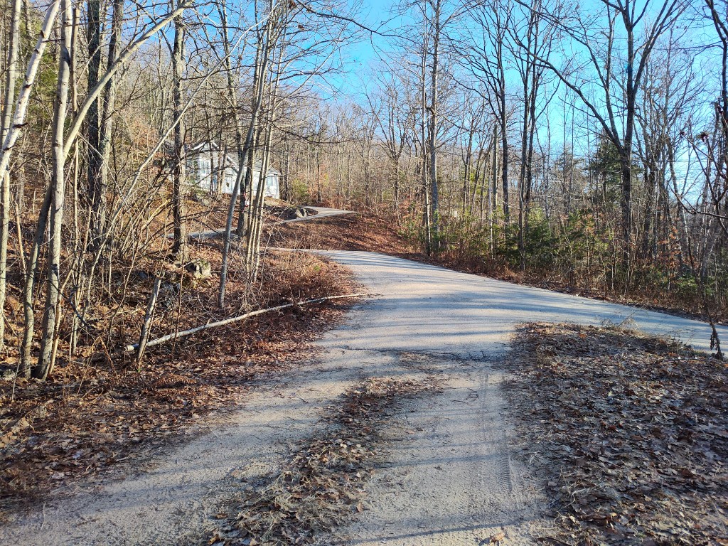 I did go outside around 2:40 PM when the sun was still out – but already well to the west – and the temperature was 36°F/2°C. It was a gorgeous day: the sky was blue and free of clouds, and the sunlight was still bright and yellow white. I deliberately didn’t put on gloves so my hands could get a dose of sunlight. Of course, the air was a wee bit nippy, so I snapped a couple of photos of the path leading to Huttwil Drive and, by extension, the house across the road from here and quickly dashed back inside the house.