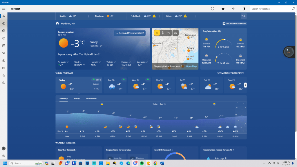 Hi, everyone. It’s late morning here in my corner of New England. The sun, thankfully, is out, and the snow that has affected Carroll County and other parts of “almost Maine” has – also thankfully – moved away from the area. Currently, the temperature is 25°F/-4°C under sunny conditions, but with the sunlight bouncing off the snow on the ground and a gentle (3 MPH/5 KMH) southwesterly breeze, the feels-like temperature is 37°F/3°C.