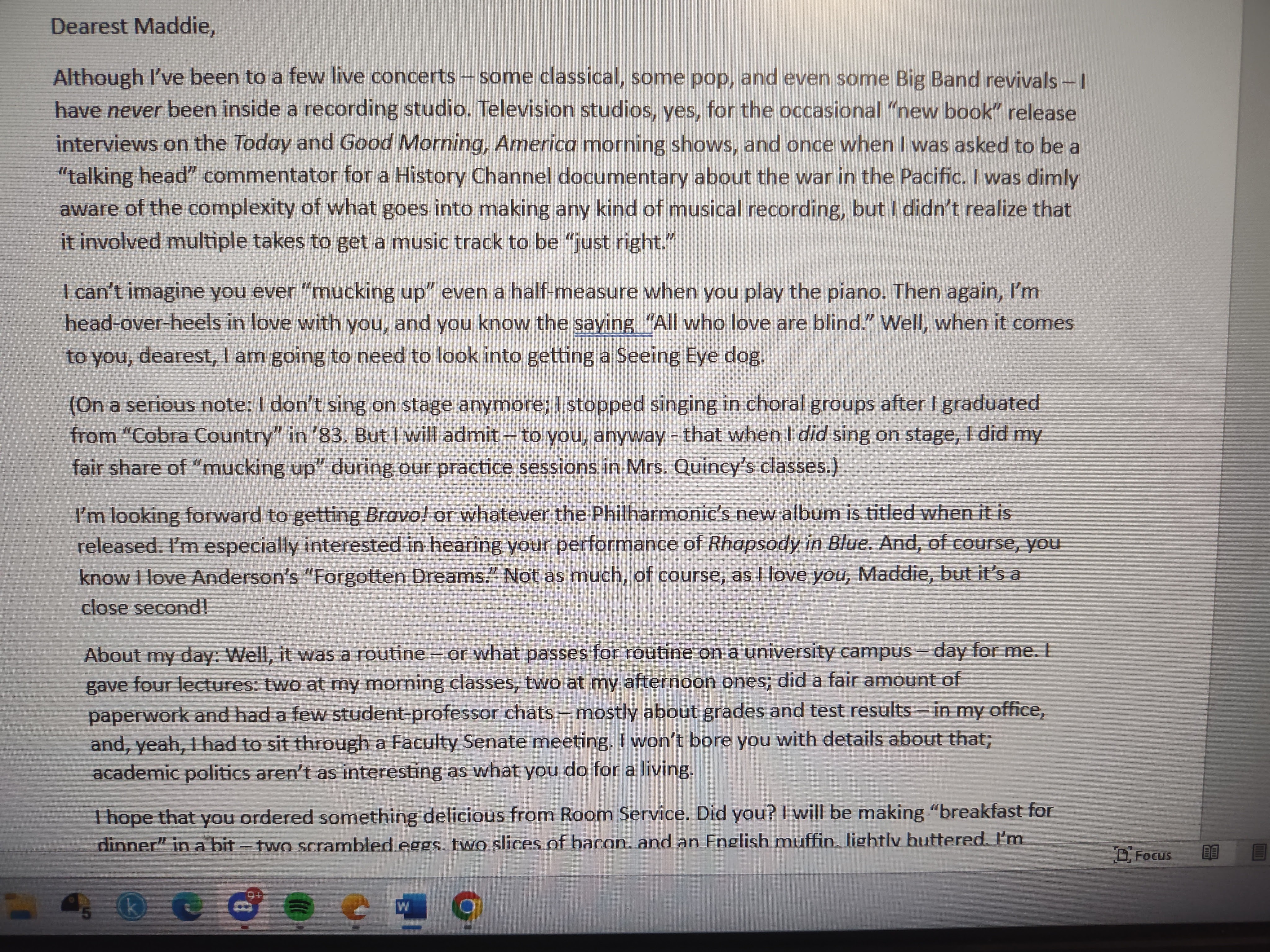 After my midday break – around 1:30 PM, I reckon – on a snow-free Martin Luther King, Jr. Day, I resumed work on Reunion: Coda’s 12th chapter – the epistolary part of the novel in which my two leads, history professor Jim and concert pianist Maddie, are separated by 3,000 miles of Atlantic Ocean because she’s in her hometown of London, recording an album at Abbey Road Studios with the New York Philharmonic.