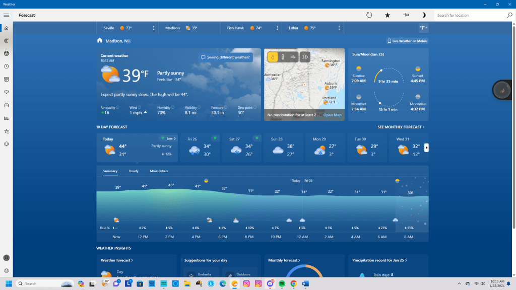 Hi there, dear readers. Itโs a cold but sunny winter morning here in east central New Hampshire. Currently, the temperature is 31ยฐF (0ยฐC) under partly sunny conditions. With humidity at 89% and the wind blowing from the east-northeast at 1 MPH/1 KMH, the feels-like temperature is 36ยฐF (2ยฐC). Today, we can expect partly sunny skies and a high of 44ยฐF (7ยฐC). Tonight, the forecast calls for light snow showers to pass through the area. The low will be 31ยฐF (0ยฐC).