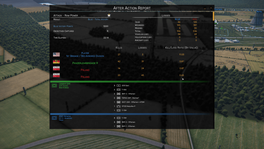 To my surprise, yesterday’s skirmish was decisive and less costly than usual. The unit I commanded earned a decent Kill/Loss ratio of 11.03, and the 1st Brigade of the 3rd Armored only lost three Vulcan air defense vehicles.