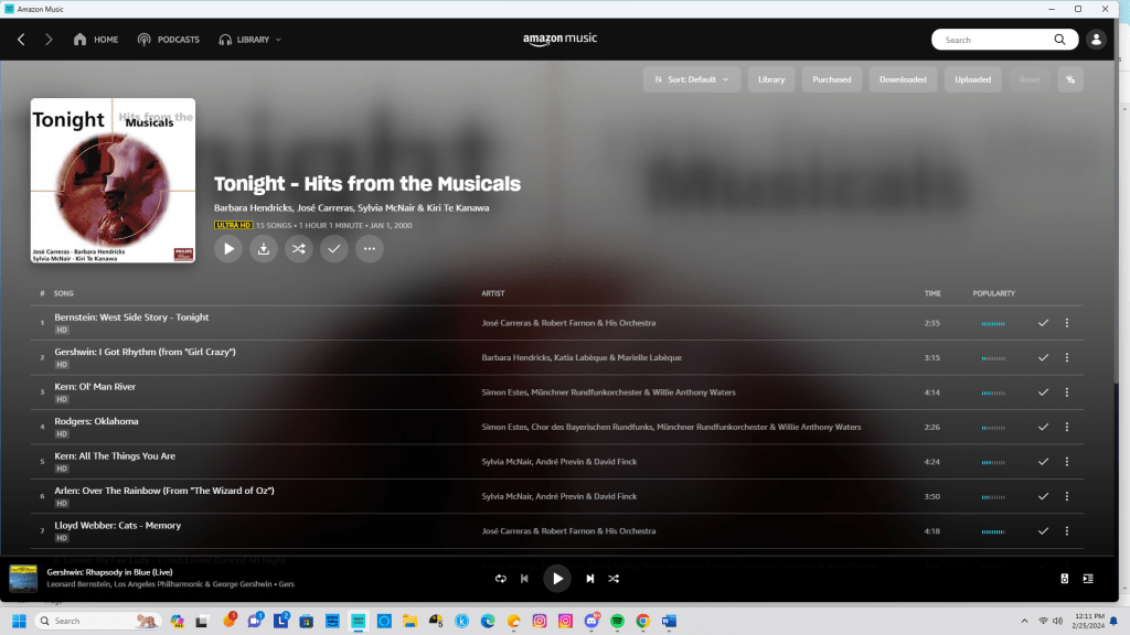 And because I need to get away from my office at least for a while, I decided to listen to one of my CDs in my bedroom rather than on my desktop PC’s Amazon Music app. I picked one of the last physical media albums I purchased in Florida before The Big Move North: Tonight: Hits from the Musicals (Philips Classics, 1985).
