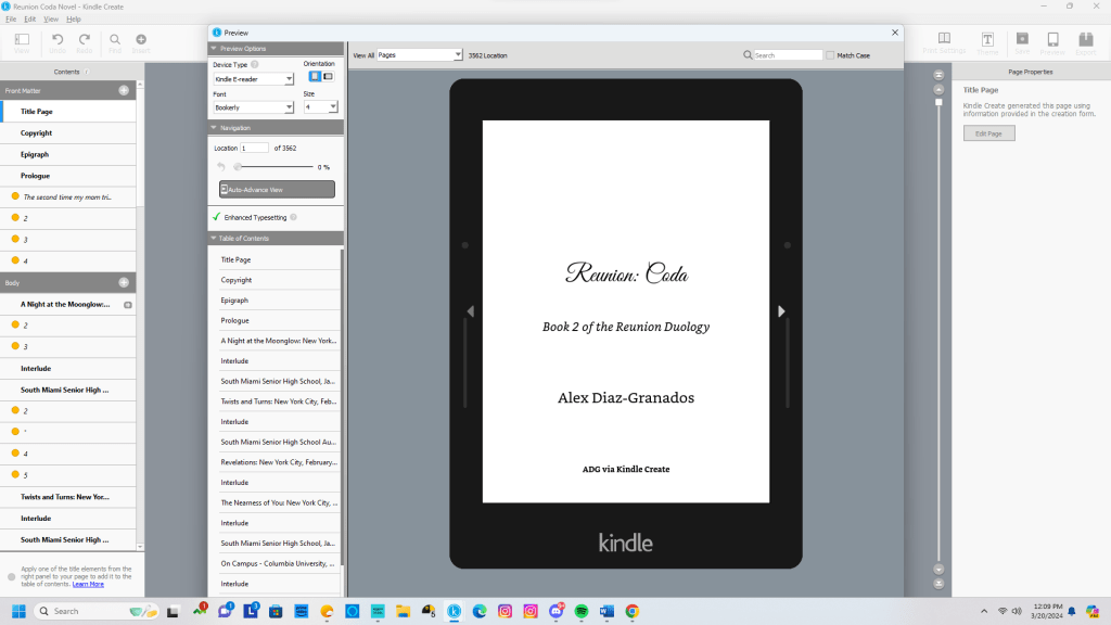 The second thing I did might seem premature. Still, I decided to put a copy of the Reunion: Coda manuscript in my Kindle Create app so I could begin the tedious and often confusing process of prepping the novel for publication on Kindle Direct Publishing. Yes, the manuscript is still unfinished, and I have not written any of the “front matter” bits that most books have. You know…a foreword (which I plan to write), an acknowledgments page to thank everyone who has helped me in my author’s journey, and an introduction to the novel. I did, however, create a file that contains the latest draft of the novel (13 chapters, including the prologue, plus a copyright page, the epigraph, and a title page).