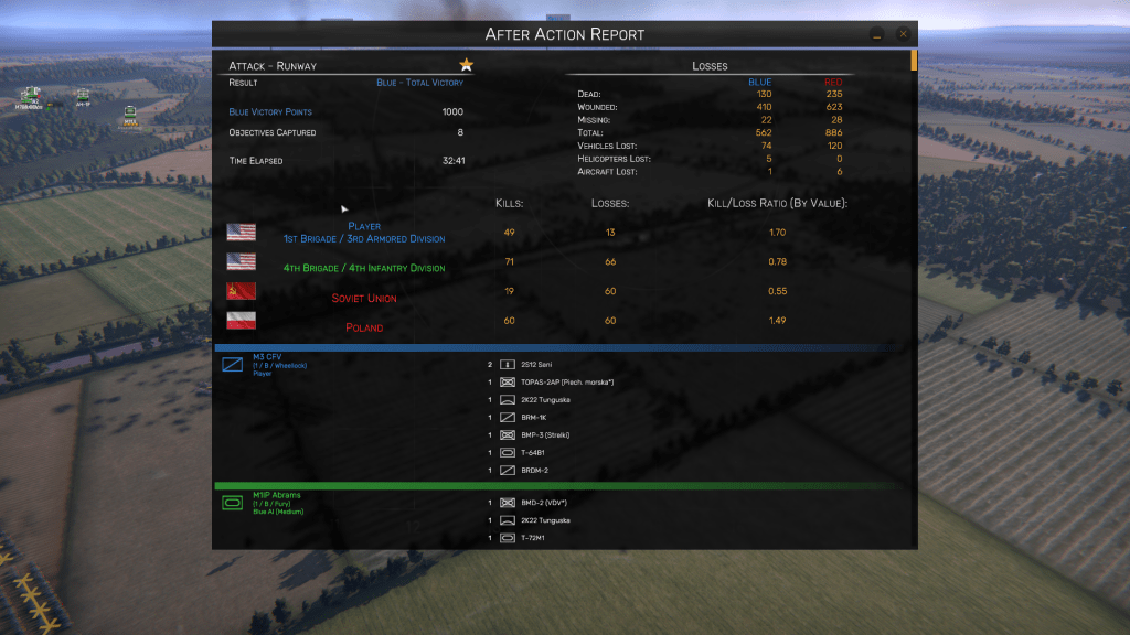 The extra 10 minutes paid off; I won a Total Victory over the AI’s “Red Force” and killed more of them than they did me. But the Warsaw Pact kept fighting until the end, trying one more – but feeble – counterattack to take back one of the Objective Zones near the NATO airfield I had freed from Soviet and Polish forces.