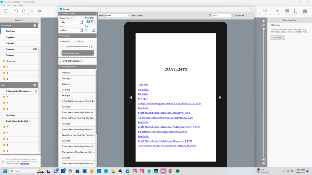 When it comes to Reunion: Coda, I’m taking a more systematic approach, even though I haven’t sketched out the whole novel or the individual chapters. For the first 15 chapters, I didn’t use any outlines at all. Each day, I’d read what I wrote the previous day – in Tampa before December 12, 2023, or in Madison, New Hampshire after December 15 – and then just figured out, “What happens next?”