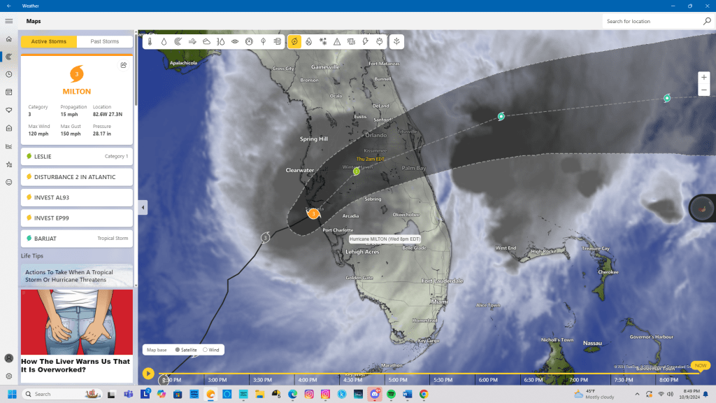 I don’t have much to share today. I did a writing exercise this morning and published it on my blog at midday, had some Cream of Mushroom soup for lunch, went out twice, and fretted about all the folks I know in Florida who will be affected by Hurricane Milton when it hits the Gulf Coast. I’ll be back home in Miami soon, and because hurricane season lasts – officially – until November 30, I hope I don’t experience any tropical storms shortly after I arrive.