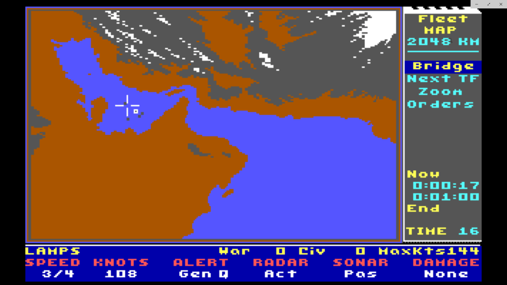 Of the two, Strike Fleet was my go-to game because it was more realistic than Destroyer and had somewhat better graphics. Players could command as few as one warship, like an FFG-7 Oliver Hazard Perry-class frigate in Stark Realities, or a multi-ship task force with cruisers, destroyers, and frigates. There was even a “grand campaign” depicting a Third Battle of the Atlantic, pitting U.S. Navy task forces against Soviet fleet units in a series of battles for control of the North Atlantic in what was then a near-future late 1980s setting.