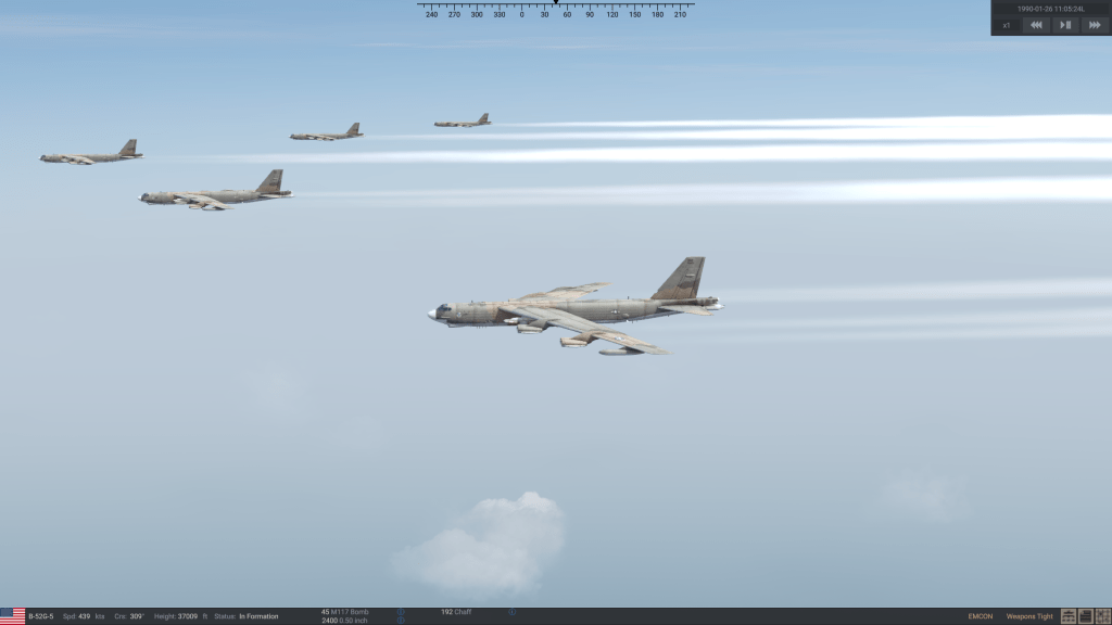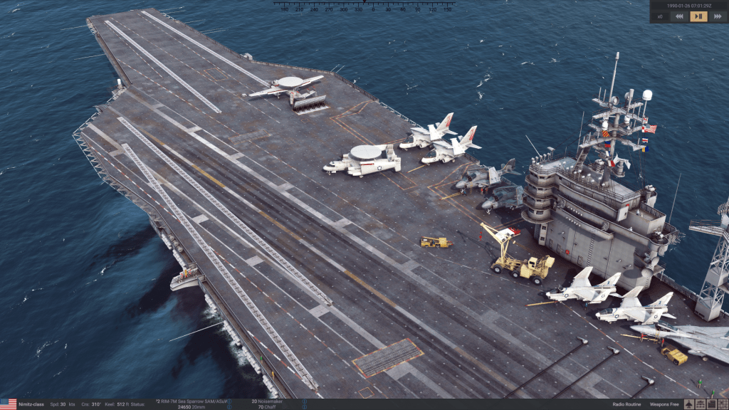 Yesterday, I attempted to play the Desert Spear scenario, which focuses on naval and air operations during the first day of Operation Desert Storm in 1991. I commanded Task Force 70 (TF-70), led by the Nimitz-class carrier USS Carl Vinson, supported by two P-3C Orion ASW aircraft and eight Air Force B-52 strategic bombers. The mission was to destroy Iraq’s small navy in the Persian Gulf, conduct offensive air operations against Iraq’s air force, and protect my task force from Silkworm anti-ship missiles.