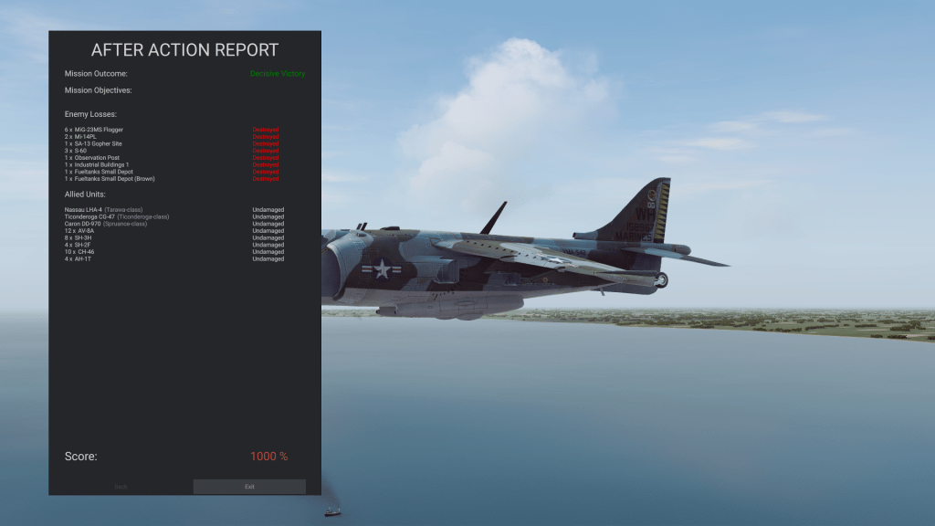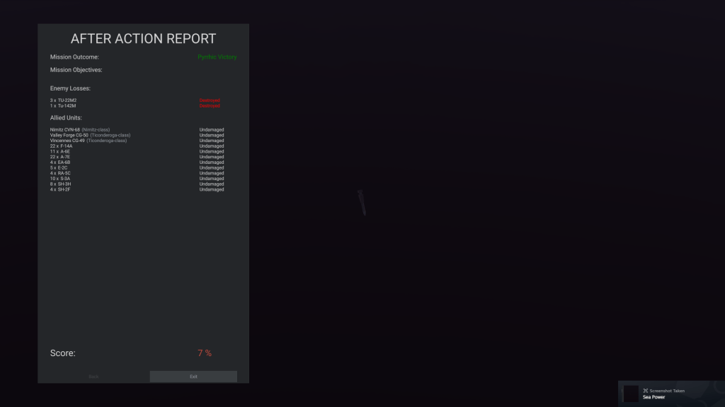 Unfortunately, even though NATO did not suffer any casualties – all my ships and aircraft were undamaged, and all four Soviet planes were shot down – the game only awarded me a Pyrrhic victory with a score of 7%.