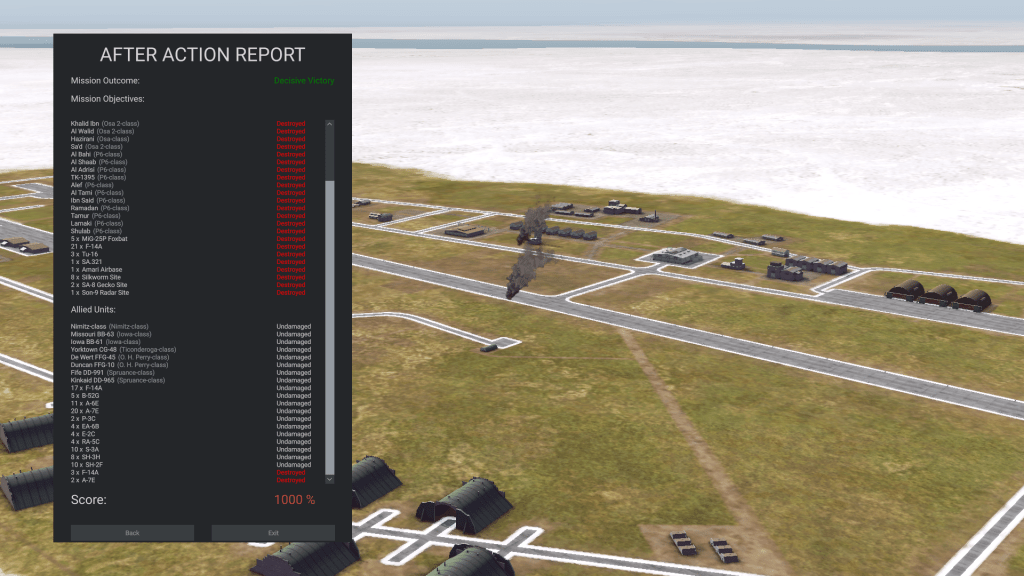 Over time, I learned from my mistakes and spent more time in the mod. I figured out how to handle the Foxbats, though I had to accept losing at least one Tomcat to enemy missiles. Once, I achieved a 5:0 kill/loss ratio but quit early due to fatigue and unable to save. Each time I played Desert Spear, I ticked off more objectives from the list, even if I quit before finishing the scenario.