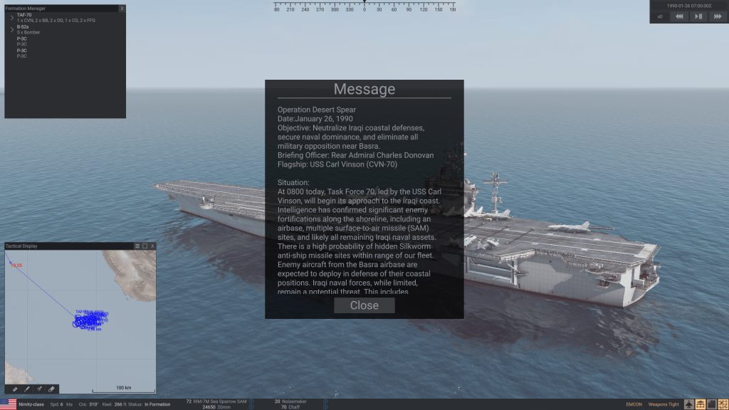 Set – supposedly – on the first day of Operation Desert Storm, Desert Spear is a moderately easy mission (it has a two-star difficulty rating) in which you command a carrier battle group centered on an unnamed Nimitz-class aircraft carrier (the mission briefing tells you it’s the USS Carl Vinson, but the in-game warship doesn’t have the Vinson’s pennant number or name on the hull) in the Persian Gulf.