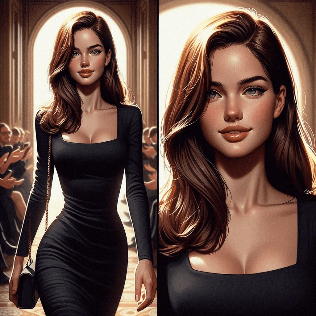 Her accent is refined and elegant, like a cross between FDR and a British aristocrat. I swivel around and there she is, clutching a bag stuffed with books from Book Culture—that quaint little bookstore on Broadway. Her hair is the color of caramel, cascading in loose waves that brush her shoulders with a gentle grace. Her hazel eyes, framed by arched brows, are windows to her soul, expressive and vibrant. They catch the club’s dim lights, reflecting a spectrum of warm colors. Her heart-shaped face is turned slightly, the soft contours of her cheeks tapering to a delicate chin, giving her an air of approachability. Her lips, reminiscent of a Gibson girl’s, hold a promise of a smile that could light up the darkest corners of any room. She’s wearing a sky-blue dress that hugs her curves in all the right places. She’s breathtaking.