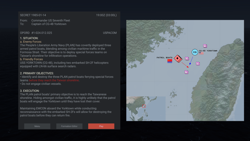 Unlike the original game, the Redux version provides greater detail, with players navigating civilian maritime traffic while attempting to locate and eliminate three People’s Liberation Army Navy (PLAN) patrol boats covertly transporting Chinese Special Forces infiltration teams into Taiwan.