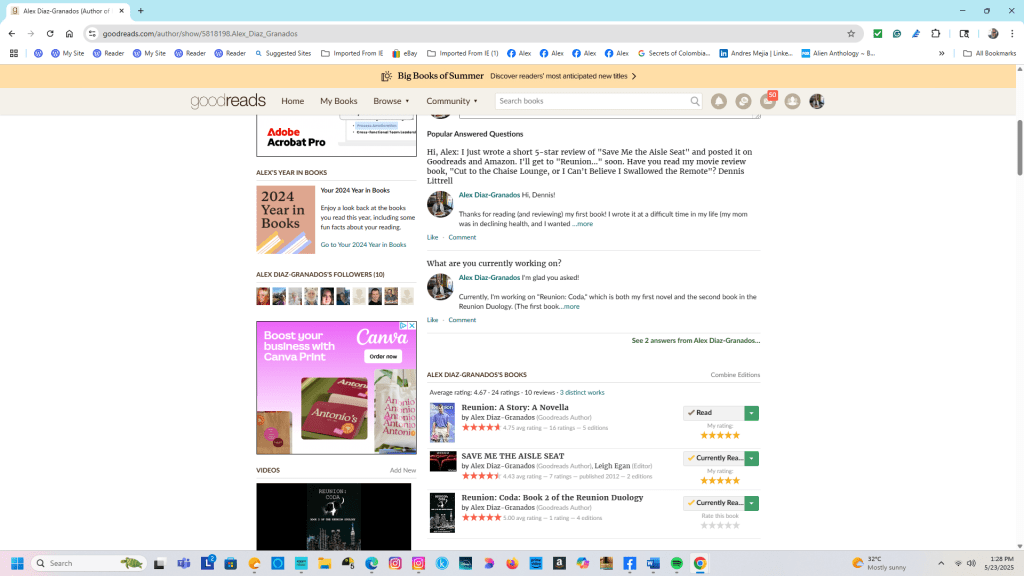 I spent part of my morning working on my Goodreads Author’s page. I added the “Boy of Harvard” promo video for Reunion: Coda that my friends Juan Carlos Hernandez and Adria K. Woomer-Hernandez produced for me a few weeks ago. There it joins the other video they made back in late 2023 – shortly before I moved from Tampa to New Hampshire – for the first book in the Duology, Reunion: A Story. I might add a few more quotes from Reunion: Coda later if I don’t get bogged down with the Kindle Create project I have on the back burner, but at least my author’s page looks like…well…an author’s page!