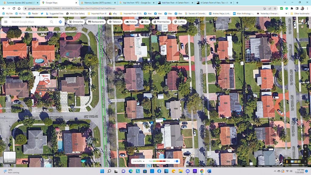 I’m sure that childhood nostalgia is a major factor re that house. 1977 was not the best year for me. I turned 14 in March, but even before that happened, my mom’s dad (the one grandfather I knew well; my paternal one died in 1967, when I was four) broke his hip due to a fall and Mom, the ever-dutiful younger daughter, flew to Bogota to care for him in January. On the 19th of that month, it snowed in Miami, but I was sick in bed and missed it. On March 7, I broke up with Girlfriend No. 2 after I found out she had cheated on me. She was one year ahead of me in school, see, so when I was finishing sixth grade, she was already in junior high. (I guess I was held back a year or something while I learned English?) Since we were in different schools, of course temptation turned her head, so….(If this sounds familiar somehow, it’s because it inspired the Jim-Kathy breakup in the Reunion Duology.) And then…of course, my grandfather passed away in April of 1977, which prompted my now-widowed grandmother to fly up to Miami and stay with us for a while…and it was she who convinced my mom to sell the house on 102nd Avenue and buy our next…and last…home. I wasn’t happy about that then, and even though I learned to live with my mom’s decision, I think my 14-year-old self’s memories linger still, coloring how I feel about the townhouse now.