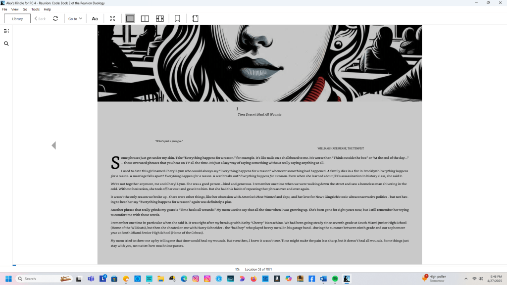 As the four-month anniversary of the publication of Reunion: Coda approaches, I find myself reading it again—this time not only for professional reasons, like fixing issues or being self-critical, but to enjoy the story as it stands. I’m not embarrassed to admit that I revisit the three works of fiction I’ve written since 1998; all writers return to their work after completing the drafting, editing, and revising stages.
