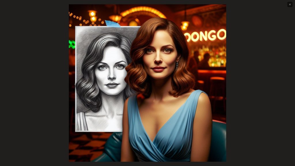 Her hair, the color of caramel, cascades in loose waves that brush her shoulders with effortless grace. Her hazel eyes, framed by arched brows, are luminous and expressive, catching the club’s dim lights like facets of amber and green. Her heart-shaped face, softened by the delicate contours of her cheeks, holds an inviting warmth. Her lips, poised in a polite smile, seem to carry the promise of lighting up even the darkest corner of the room. The sky-blue dress she’s wearing hugs her frame perfectly, a splash of softness against the nightclub’s gritty backdrop. She’s breathtaking.