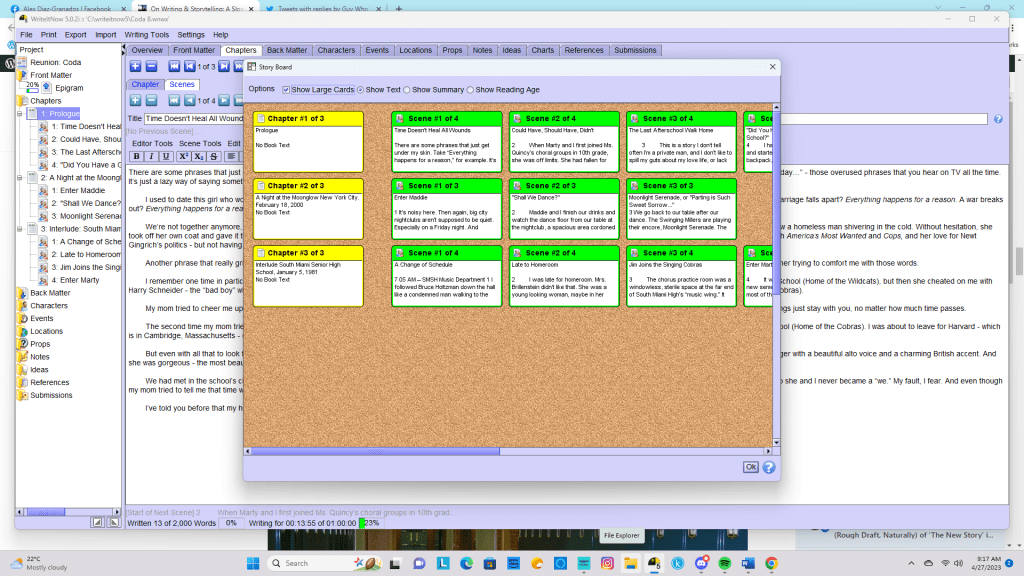 It took me two years to write the novel. The path to publishing Reunion: Coda was anything but smooth. I moved twice in ten months—first from Tampa to Madison, New Hampshire, then back to Miami—each move a wrench in the gears. What began as a burst of creativity turned into a long, torturous, but ultimately satisfying odyssey that produced not only a 529‑page novel but also a companion novelette, Comings and Goings: The Art of Being Seen.