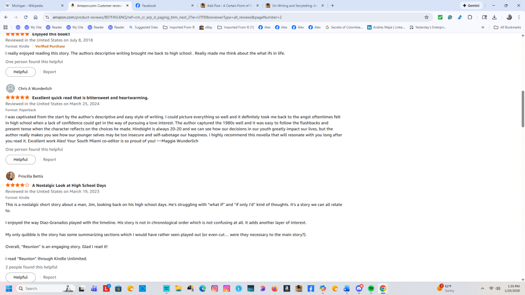 I was captivated from the start by the author’s descriptive and easy style of writing. I could picture everything so well and it definitely took me back to the angst oftentimes felt in high school when a lack of confidence could get in the way of pursuing a love interest… Hindsight is always 20-20… I highly recommend this novella that will resonate with you long after you read it. Excellent work Alex! Your South Miami co-editor is so proud of you!
