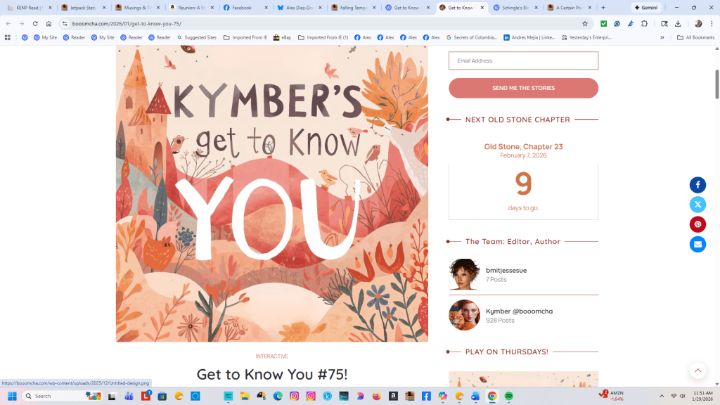 Every so often, Kymber posts another round of her “Getting to Know You” questions, and I always enjoy jumping in. Round #75 landed this week, so here are my answers — equal parts honest, reflective, and lightly caffeinated.
