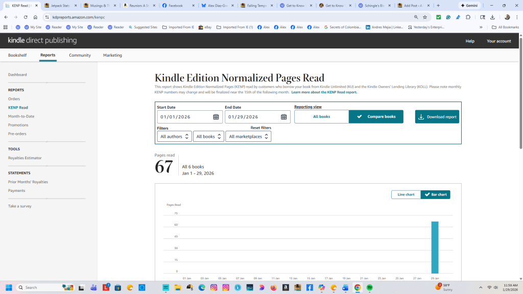 But I’d forgotten about Kindle Unlimited. Someone out there read Reunion: A Story from start to finish, which nudged my January royalties up by a mighty 32 cents, bringing the total to $14.58. According to KDP, that’s 67 KENP pages read — meaning one reader single‑handedly accounted for 2% of my earnings this month.