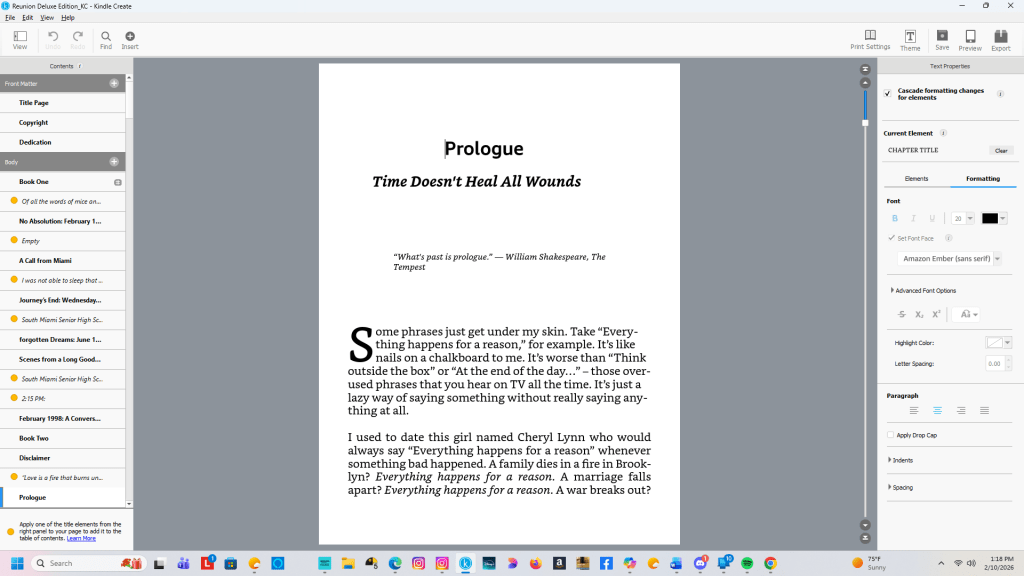 For Reunion: A Story and Comings and Goings, this is manageable—they’re short, with few subheadings. But Reunion: Coda is a different creature entirely. Two timelines, multiple locations, and a structure that absolutely depends on clear, properly formatted subheadings. When I write in Word, everything is already styled correctly. Kindle Create just… has other ideas.