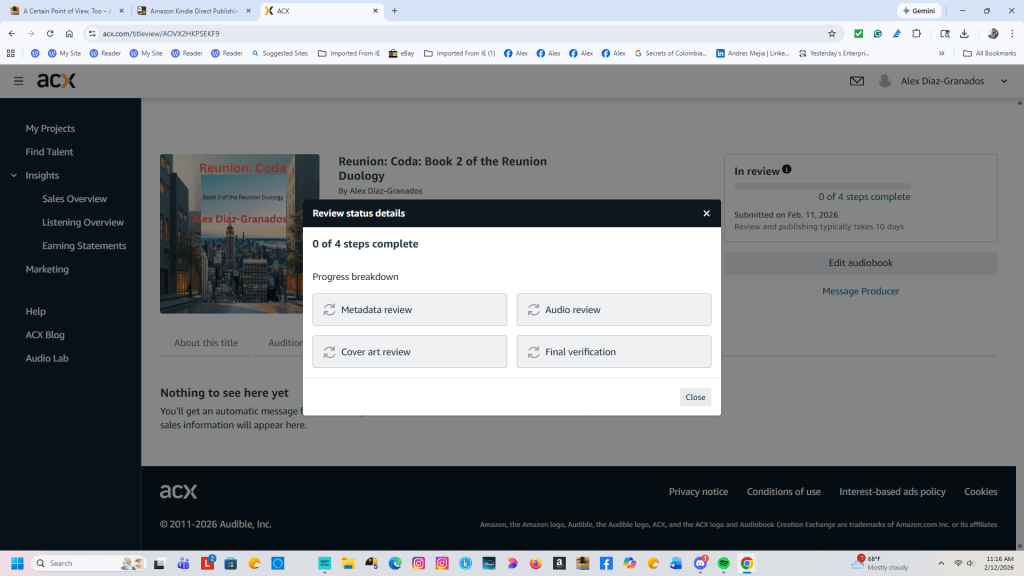 I’m not losing sleep over the other review steps either. The one stubborn audio file that needed attention was replaced with a crisp new recording, and the metadata lines up perfectly with the hardcover, paperback, and Kindle editions. But if you know me at all, you know patience is not my natural state—especially when something this important is in limbo. And trust me, releasing an audiobook version of my first novel is muy importante.