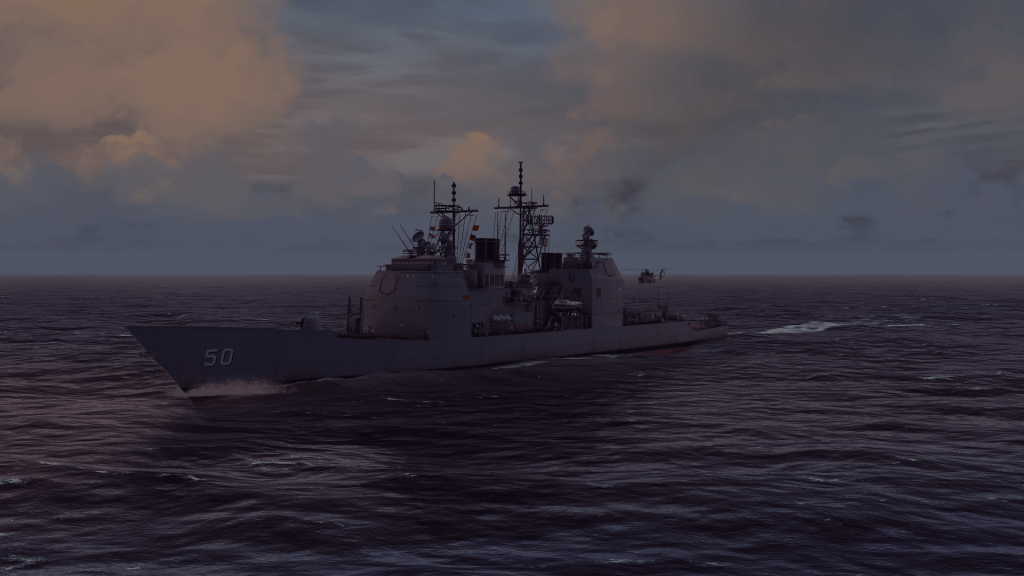 I’ve been playing “Plugging the Gap” intermittently since I learned it had been added, and it’s both fun and challenging. My carrier group—built around the Nimitz-class USS Dwight D. Eisenhower—includes its air wing and an escort of three Ticonderoga-class guided missile cruisers, four destroyers (Kidd- and Spruance-class), and two frigates. A Los Angeles-class fast attack submarine lurks ahead, providing distant support and stand-off missile capability against enemy warships and the Soviet-held airbase on one of the captured Faeroe Islands.