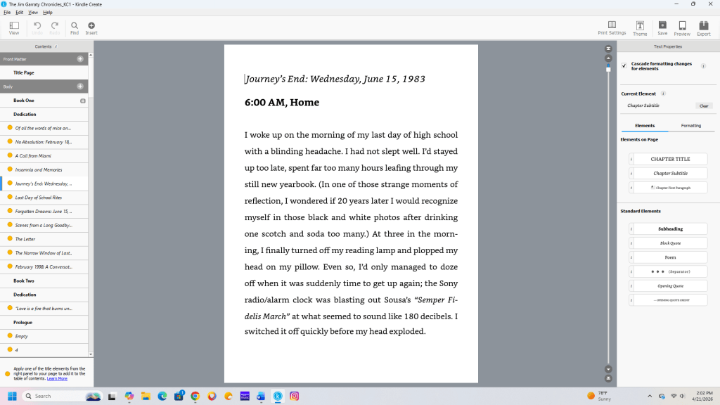 As for writing news, I’m still deep in The Jim Garraty Chronicles inside Kindle Create, wrestling—yet again—with chapter titles and subheadings. It never fails to amaze me that a program designed to simplify self‑publishing somehow complicates the most basic stylistic conventions. Kindle Create seems obsessed with aesthetics while bungling capitalization rules that have existed for decades. Yes, I can fix the subheads manually, but it’s tedious, time‑consuming work. Still, Reunion: Coda uses a dual‑timeline structure, and those subheadings matter, so I’m sticking with it.